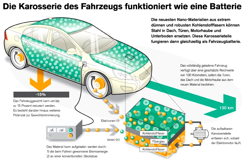 <Der große Schwachpunkt bei Elektrofahrzeugen ist nicht der Antrieb, sondern die Batterie. Diese ist meist groß, schwer, teuer und reicht nur für wenig mehr als hundert Kilometer. Eine Aufladung dauert häufig einen halben Tag und die Ladevorgänge sind begrenzt. Doch das könnte bald der Vergangenheit angehören: Der schwedische Autohersteller Volvo experimentiert zurzeit gemeinsam mit verschiedenen Unternehmen und dem Imperial College London an einer neuen Außenhaut, die nicht nur als Batterie fungiert, sondern auch noch 15 Prozent leichter als eine herkömmliche Karosse sein soll. Damit wird das komplette Auto zum großen Energie-Speicher.