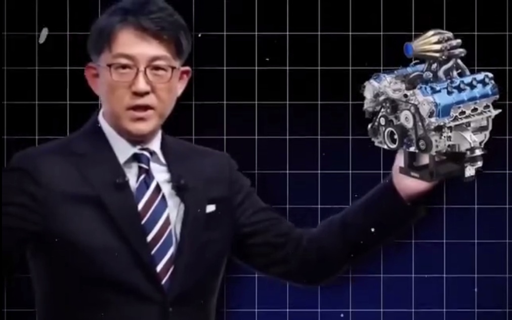 Das Bild ist eine Fotomontage aus zwei Aufnahmen. Darauf ist jeweils ein Mann auf einer Bühne zu sehen, der in beiden Fällen neben einem Motorenmodell des weltgrößten Autoherstellers Toyota zu stehen scheint.