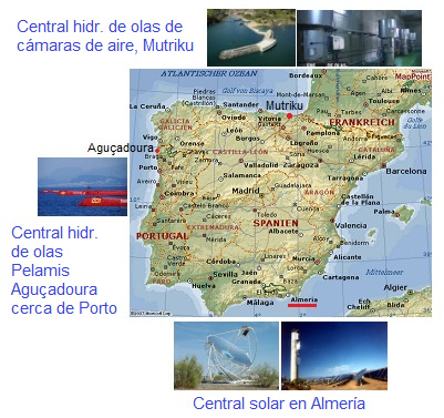 [5] Karte von Spanien und Portugal mit Almeria (Sonnenkraftwerke), Aguçadoura (Pelamis-Park) und Mutriku (Kammer-Wellenkraftwerk):