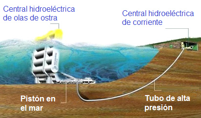 Esta central eléctrica de olas de ostras se instala en una playa en una cierta produndidad del agua y las olas mueven la barrera hacia delante y hacia atrás sin fin, igual que una ostra se está moviendo. La central eléctrica de ostras fue desarrollada por la empresa Aquamarine Power en Edimburgo, Escocia (http://www.aquamarinepower.com).