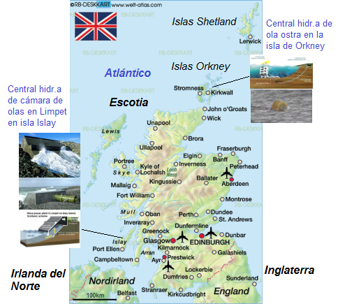 Mapa de Escocia con la isla de Islay con la central de olas de cámara, y con las islas Orcadas con la central de olas de ostra [3,4]