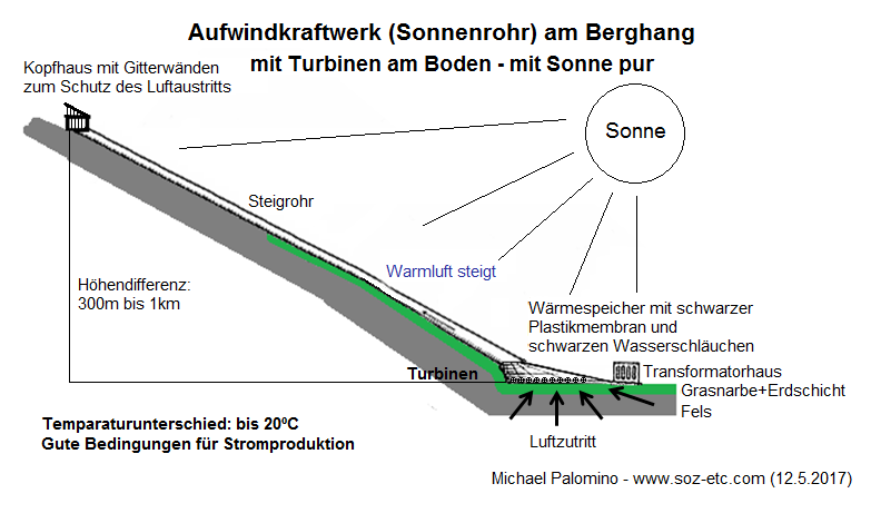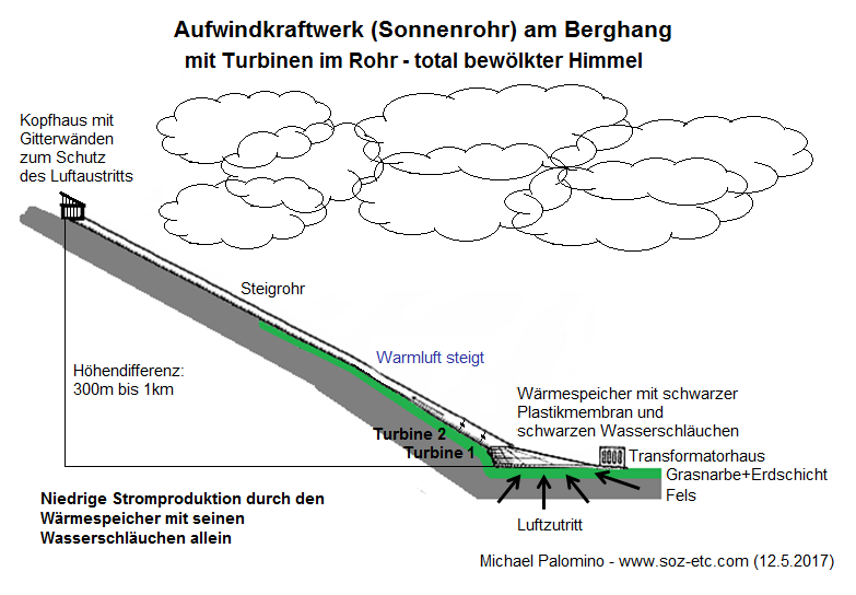 Die Röhre kann bis 5m Durchmesser haben, mehr nicht, sonst kann man sie in den Bergen nicht montieren. Generell kann jedes Bergtal mit mittlerer Sonneneinstrahlung solch ein Aufwindkraftwerk (Sonnenrohr) an einen Berg bauen. Man kann die Rohre dunkelbraun anstreichen, so dass sie bei Inversionswetterlage auch warm werden. Man kann die Rohre auch aufschütten, so dass sie vor starkem Frost geschützt sind. Man kann auch das letzte Ende der letzten 100m freilassen, damit bei Inversionswetterlagen das Rohr warm wird und so ein Luftsog gefördert wird. Das ist alles noch unerforschtes Gebiet und muss man alles ausprobieren.