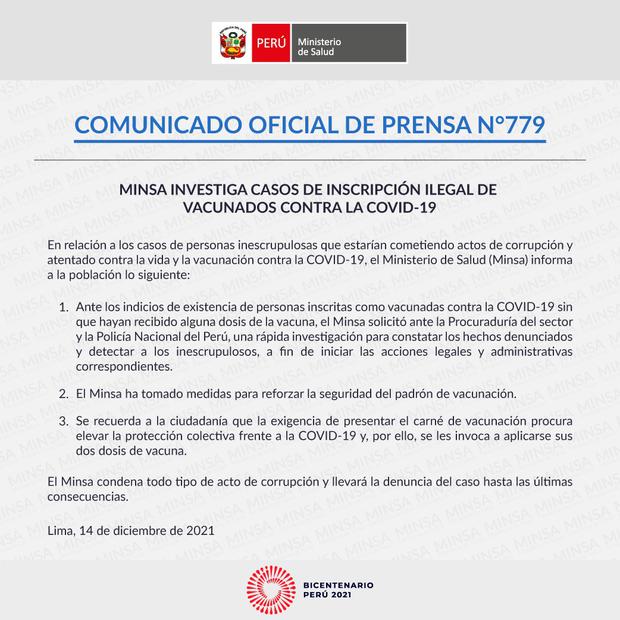 precisó que una vez las dosis lleguen al Perú, serán
