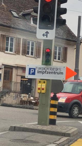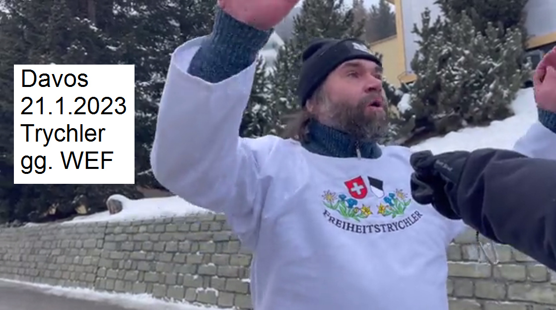 Widerstand Schaffhausen 21.1.2023: Wegweiser "Impfzentrum" und "Turbokrebs" [16] - Trychler gegen WEF in Davos 21.1.2023 [19]