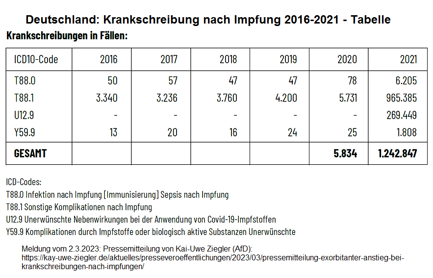 Berlin den 02.03.2023 Exorbitanter Anstieg bei Krankschreibungen nach Impfungen: Von 5.834 Fällen im Jahr 2020 auf 1.242.847 Fälle im Jahr 2021 [6]