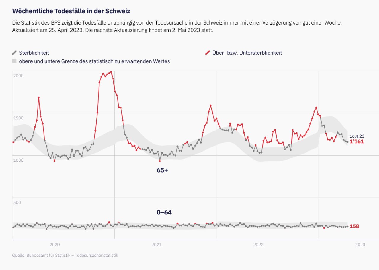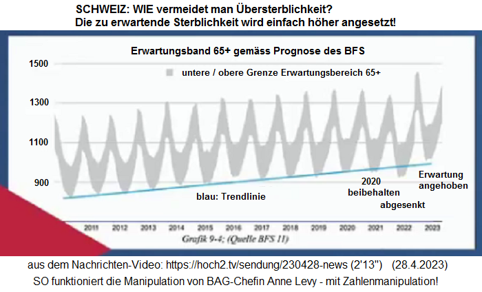 Zahlen "Corona"-Impfmorde Schweiz 29.4.2023: Levy vertuscht die Übersterblichkeit mit Statistiktrick im BFS: SCHWEIZ: WIE vertuscht man Übersterblichkeit? Die zu erwartende Sterblichkeit wird einfach höher angesetzt! Wer gab wohl den Befehl dazu? [1]