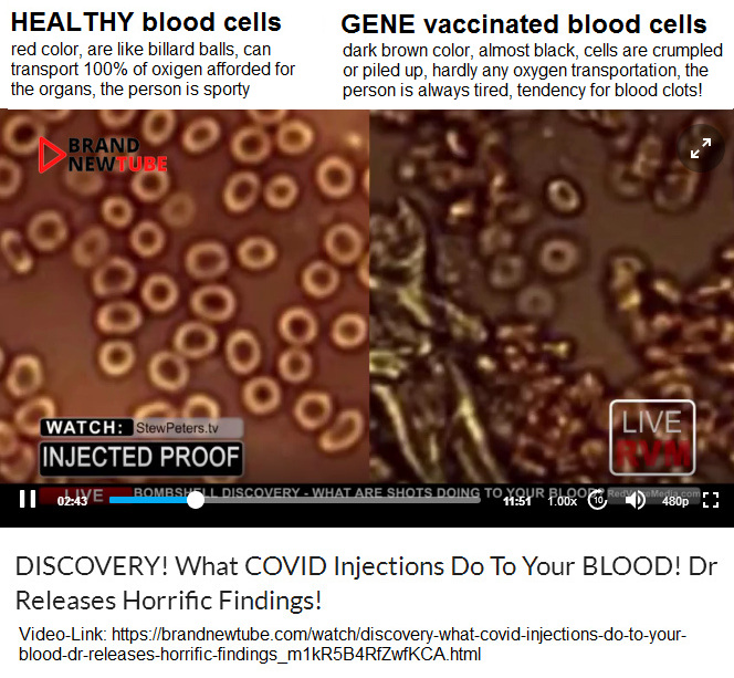 See also here the difference between healthy blood cells (round) and vaxxed damaged blood cells (forming lines and clots):