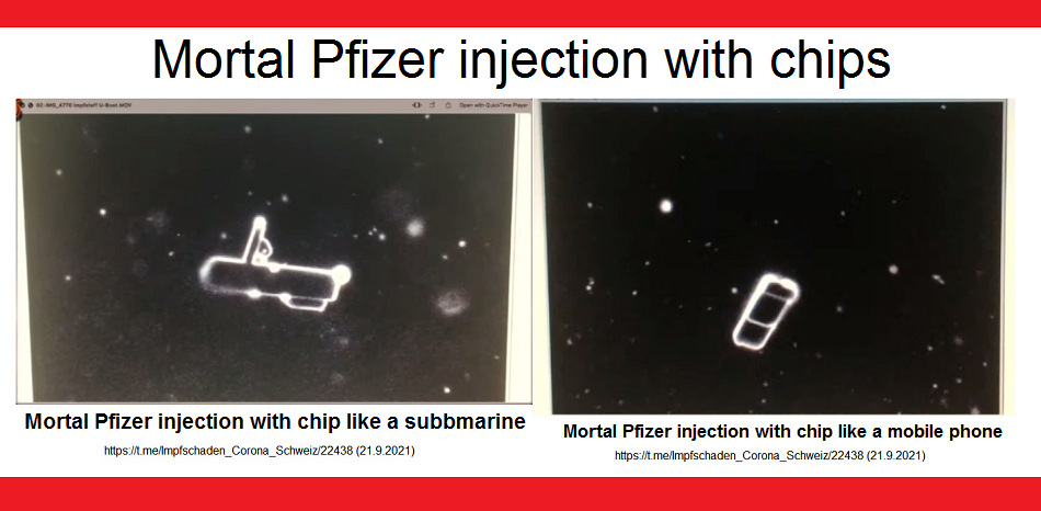 The mortal Pfizer vaccine under the microscope shows chips in form of a submarine or a mobile phone [6]