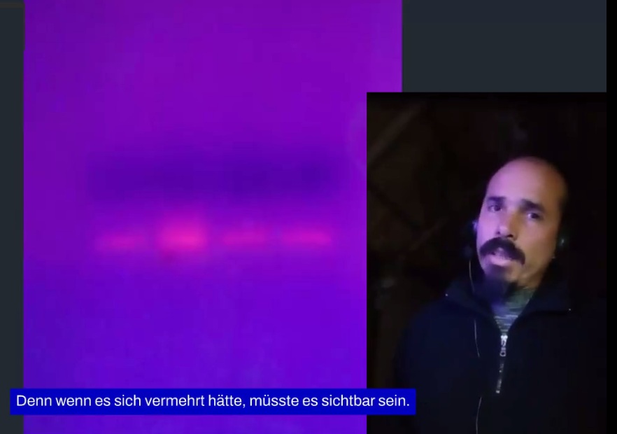 Y este es el resultato final: es un resultado negativo. Porque si hubiera replicado, tendría que ver en esa lámina un color azul sobre la banda violeta (4'2''). Un color azul, que no se ve [con un nada], significa que no hubo replicación de la ARN mensajero porque NO ESTÁ (4'11''). Porque el ARN mensajero no está en los viales de Pfizer y de Moderna (4'17''). Es decir que no solo nos mintieron en el sentido que han metido grafeno, microcircuitos y nanocircuitos en todas las vacunas Covid (4'30''), sino además nos mintieron porque supuesto ARN mensajero NO ESTÁ adentro de esas vacunas (4'38'').k