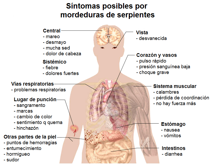 -- El esquema sobre los síntomas después de las mordeduras de serpiente generalmente muestra: los efectos venenosos son: mareos, desmayos, más sed, dolor de cabeza, daño ocular con una vista borrosa, fiebre, dolor en todo el cuerpo, latido rápido / pulso elevado, presión arterial como una montaña rusa, shock grave en los vasos sanguíneos, calambres, pérdida de coordinación, debilidad, problemas respiratorios / dificultades respiratorias, náuseas, vómitos, diarrea, sordera, hormigueo, sudoración, y en el lugar del mordisco: sangrado, marcas de mordisco, cambio de color, sensación de ardor, hinchazón [web02]