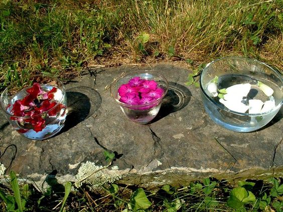 [11] Herstellung von Bachblütenessenzen: Bachblüten in Wasserschalen in der Sonne 01: https://www.pinterest.de/pin/374854368960529439/