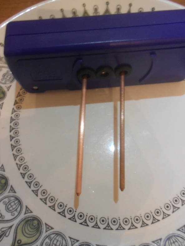 - Stecken Sie die beiden Kupferelektroden (dünne Stangen) in die dafür vorgesehenen Öffnungen des Gerätes.