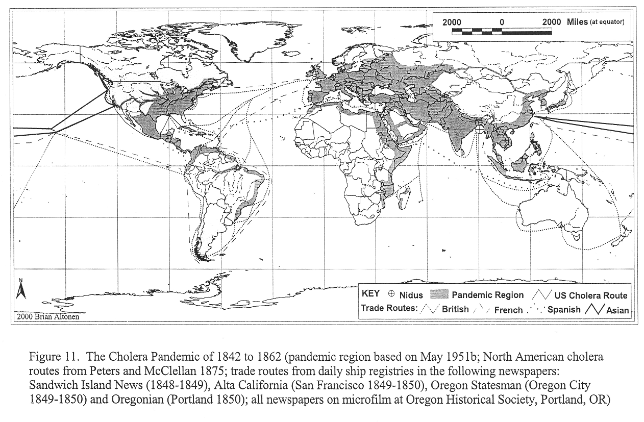 -- 1826-1837 Cholera-Pandemie ausgehend von Bengalen (Indien) mit noch weiterer Ausbreitung bis nach Russland (197.000 Tote), Mitteleuropa (Ungarn 200.000 Tote, Deutschland, Frankreich) und Skandinavien (Finnland und Schweden) und auch bis Grossbritannien (England und Wales 21.500 Tote) und durch Auswanderer bis in die "USA", mit Millionen Todesopfern [web04].