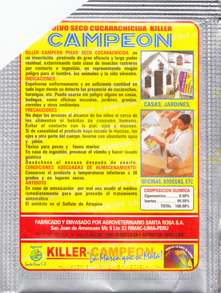 In Peru wird zum Beispiel das Schaben- und Ameisenpulver "Killer Campeón Mata-Cucarachas" verkauft. Man bekommt es in Peru eigenartigerweise im Eisenwarengeschäft ("ferretería"). Und das Pulver soll auch gegen weitere kriechende Insekten ("insectos rastreros") wirken.