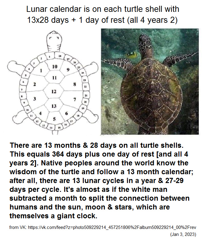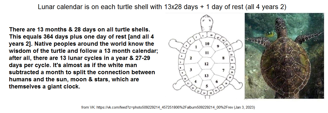 Jan 3, 2023: Lunar calendar with 13x28 days is on each turtle shell - photos with text horizontally [2]