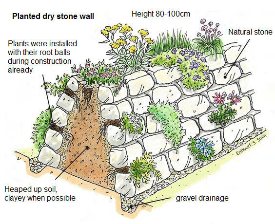 Every garden can also be planted with a dry wall and wall plants, so that insects and birds are attracted [web04]. Self-built dry stone walls can be planted during construction during. Gaps that remain serve as shelters for insects, larger cavities in the first road for toads and in the middle and upper floors for lizards [web04].
