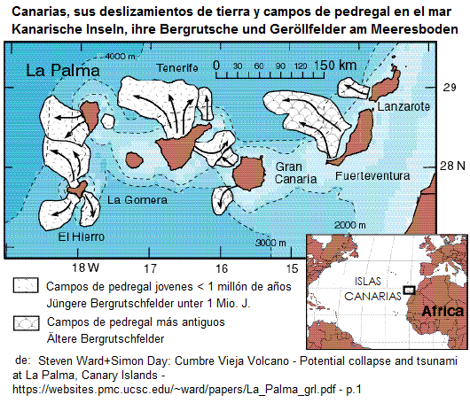 Las Canarias, Hawai y Cabo Verde, etc. son grandes grupos de islas volcánicas que tienen el potencial de deslizamientos de tierra gigantes cuando ocurren erupciones volcánicas. Estas islas están formadas por capas de lava y rocas de lava, que con el tiempo se vuelven muy inestables como una "pila de grava". El agua de lluvia se acumula en los volcanes como agua subterránea y entre las rocas de lava, cuanto más cálido es el clima, lo más hay lluvia y agua subterránea, porque las nubes vuelan más alto y la lluvia también cae directamente en el cráter. De vez en cuando ocurren erupciones volcánicas, y cuando hay mucha agua en el volcán, el agua caliente se expande, explota y toda la isla explota. Las consecuencias son mega-tsunamis con la devastación de zonas costeras enteras y con nuevos depósitos. Tales explosiones de islas volcánicas también tuvieron lugar en Japón y frente a Nueva Guinea (la explosión de la Isla de los Caballeros) [y había la explosión de la isla de Santorini en Grecia con la devastación de Creta, eso fue un caso en el Mediterráneo].