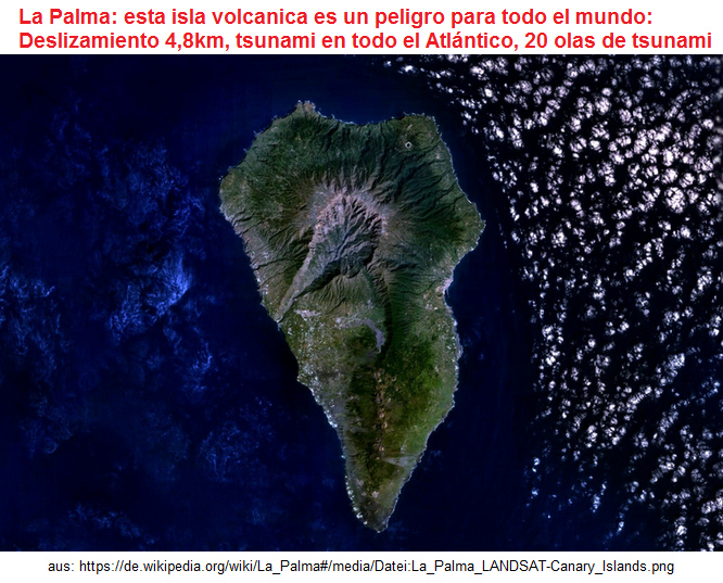 La pendiente de la hilera de volcanes se está deslizando desde 1949 ya... -- Resumen: El predecible deslizamiento terrestre gigante en La Palma (Islas Canarias) con un tsunami gigante -- Las islas volcánicas no tienen roca sólida, son como un "montón de grava" con agua subterránea - viene una erupción volcánica, el agua se calienta y la isla explota -- 1949: Erupción volcánica en La Palma (Islas Canarias) - formación de una grieta de 4,8 km de largo - la pendiente deslizante: deslizamiento del flanco volcánico occidental 1 cm por año - con una nueva erupción volcánica todo se desliza hacia el mar + sale el riesgo de tsunami -- El modelo computacional de erupción volcánica y tsunami por el profesor Ward y el profesor Simon Day -- Comentario: ¡Falta eliminar el flanco occidental de la isla de la cadena volcánica "Cumbre Vieja" ! -- 27-08-2020: La Palma Cumbre Vieja en las Islas Canarias: El volcán se convierte en un montón de grava - se llena de agua, explota en la próxima erupción volcánica y provoca tsunamis durante 5 horas Vídeo: Documental Peligro de tsunami en la costa este de los "EUA" Desastres naturales Terremotos (44'16'') -- Isla de La Palma con la "Cumbre Vieja": El deslizamiento ya está en curso con una grieta de casi 5 km -- Ejemplo: Las islas volcánicas de Hawái con tsunamis de deslizamientos de tierra: Nuuanu - Alika 1 - Alika 2: Conclusiones para La Palma + para la costa este de los "EUA" -- La isla de La Palma amenaza la costa este de "Estados Unidos", las Bahamas, Cuba y la República Dominicana -- Olas de 90 m de altura en la costa oeste de los "EUA" -- Ejemplos recientes de tsunamis por deslizamientos de tierra: Hawái 1946 - Alaska 1964 -- Caso en 1888: Nueva Guinea: Los datos de la explosión de la "Isla Ritter" ("Isla del Caballero") como base para el nuevo modelo informático -- Casos: Japón con tsunamis por deslizamientos de tierra -- Casos: tsunamis por deslizamientos de tierra que azotaron "América" del Norte: Terranova 1929 + Alaska en Valdez 1964 -- Los grupos más peligrosos de islas volcánicas en todo el mundo son: Canarias, Hawái, Cabo Verde -- La Palma "Cumbre Vieja": grieta de 4,8 km de largo - la masa de tierra: 16 km de largo, 1600 m de espesor - la isla tiene 5400 m de altura en total -- Estructura de las islas volcánicas: sedimentos de lava + rocas de lava = "montones de grava" - erupciones volcánicas en Cumbre Vieja hasta 1712 -- Islas volcánicas: las lluvias aumentan la presión del agua en el volcán -- 1949: 7 días de calentamiento y erupciones volcánicas causaron la grieta de 4,8 km de largo - 400 km3 de material -- La política alta discutirá durante mucho tiempo si se debe evacuar: 830 km3 de rocas -- Explota la hilera de volcanes "Cumbre Vieja" en La Palma: Las costas afectadas: África Occidental - Caribe - "EUA" - sálvarse en edificios altos - varias olas de tsunami -- Comentario e idea: ¡eliminar la pendiente deslizante en La Palma! -- 27-08-2020: Datos y hechos sobre la amenaza de tsunami por la isla volcánica de La Palma - bomba de tiempo -- Vídeo: tsunami gigante documental parte 1 (7'46'') -- Una bomba de tiempo está en marcha: mega-tsunami contra la costa este de los "EUA" - 200 km3 de rocas caen al Atlántico -- Islas volcánicas: el magma se eleva - el agua subterránea en el volcán se calienta - la presión del vapor destruye toda la isla -- La costa plana de los "EUA" permite que los tsunamis penetren lejos -- Japón 1741: la isla volcánica de Oshawa Oshima explota -- Las explosiones gigantes de islas volcánicas siempre ocurren durante las fases extremadamente cálidas de la tierra -- Sube la lava - calienta el agua subterránea - explota la isla y provoca un tsunami gigante - los "EUA" no son preparados: Vídeo: tsunami gigante documental parte 2 (6'54'') -- Agua en el volcán en los sistemas de tuberías -- La Palma puede explotar mañana o dentro de 10.000 años -- La Palma: Primera erupción volcánica - luego la grieta se abrirá - semanas o meses para las evacuaciones -- "USA": La planificación de desastres no está preparada para un mega tsunami de La Palma -- Correlación: cuanto más cálido es el clima - cuanto más alto vuelan las nubes - más lluvia llega al centro volcánico -- La Palma: La grieta desde 1949 - deslice 1 cm por año -- Muchas más islas podrían explotar -- La Palma: El deslizamiento de un flanco volcánico es como el impacto de un asteroide Video: Día del juicio final para la Tierra con un tsunami gigante -- Investigaciones en Hawái: arrecifes de coral a 250 m de altura -- La isla volcánica de La Palma explotará y el flanco volcánico de la Cumbre Vieja ya está en movimiento -- 1949: La erupción volcánica en la isla de La Palma deja el flanco bajando -- Los geólogos de los volcanes Ward y Day advierten: la grieta llega al fondo - y el deslizamiento ya está en proceso -- Otro volcán "Cumbre Nueva" en la isla La Palma explotó hace 500.000 años - la punta del sur de la isla se llena con lava por debajo y se agranda hasta que otro flanco explota -- Cuando la isla de La Palma explota: El modelo computarizado de Ward+Day indica tsunamis de 20 a 40m de altura para la costa del este de los "EUA" Video: Día del juicio final en la Tierra con un tsunami gigante (15'0'') -- La grieta de 4,5 km en la Cumbre Vieja: este es un esquema para islas volcánicas -- Universidad de Oregon: El simulador de tsunamis indica: la costa este de los "EUA" solo experimentará pequeños tsunamis de unos pocos pies de altura -- Advertencia de Ward + Day: un tsunami gigante también va a llegar a la costa este de los "EUA" -- El tsunami en Alaska de 1958 -- Nueva York instala disposiciones para una evacuación de emergencia -- La Palma: la gente vive con este peligro gigante como si no sería nada -- Comentario: Remover y explotar el flanco occidental del volcán Cumbre Vieja -- 27-08-2020: e-mail al alcalde de Nueva York Señor DeBlasio: eliminar la pendiente volcánica elimin