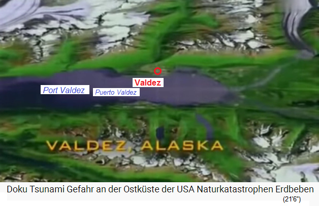En Alaska hubo un tsunami en Valdez en 1964, primero un terremoto de 8.4 y luego un deslizamiento de tierra subterráneo que desencadenó un tsunami (21'28''), el puerto de Valdez quedó totalmente destruido con un área de 1200 por 800 metros, 30 muertos, incluidos muchos niños, tanques de petróleo explotados, etc. (22'6'').