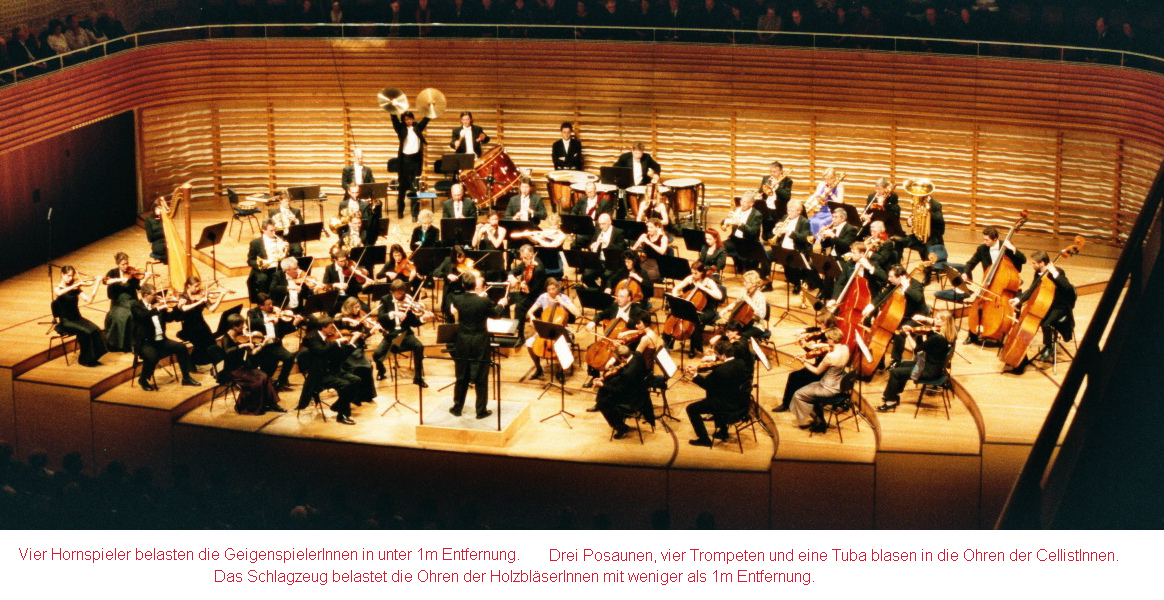 Respecto a daños de oídos el orden de puestos en una orquesta no de todo es satisfactorio cuando instrumentos de vientos fuertes siempre molestan a otros músicos directamente a su oido, y cuando timbales están cerca de otros músicos. Según normals de trabajo falta un muro de insonorización. Se puede aliviar el problema con 2m de distancia, solo falta espacio para eso. El sumario es que toda la operación de música clásica debería ser controlada con una supervisión de medidores de sonido y con pruebas de estrés. O se tiene que construir instrumentos con menos fuerza.