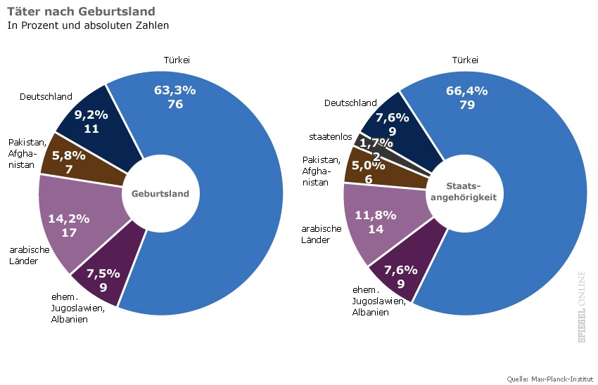 Von 122 Tätern wurde der weitaus größte Teil, 76 nämlich, in der Türkei geboren. Erst deutlich dahinter folgen die arabischen Länder und die Staaten des ehemaligen Jugoslawien. Weniger als zehn Prozent der ermittelten Täter wurden in Deutschland geboren, noch weniger (7,6 Prozent) besitzen einen deutschen Pass.