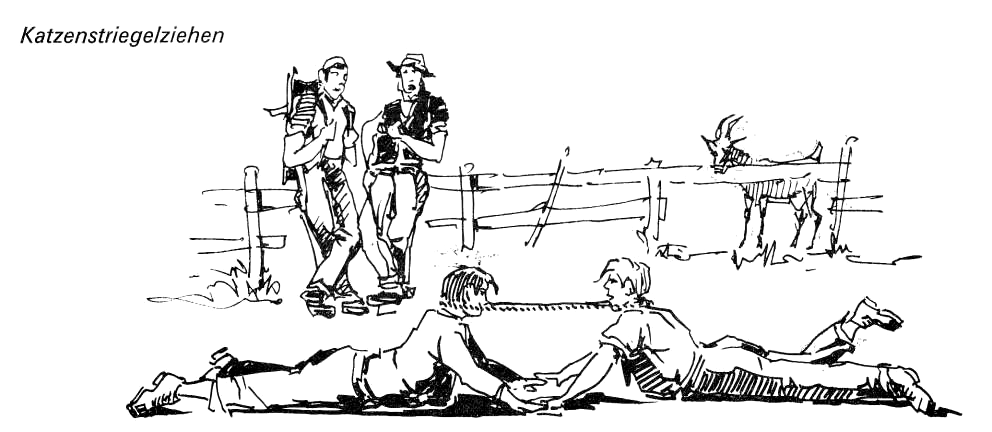 [Zwei Leute sitzen mit den Füssen gegeneinander und haben einen Stecken in der Hand, den sie sich gegenseitig aus den Händen reissen sollen].