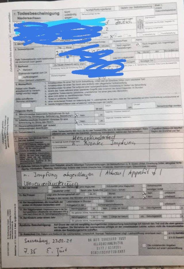 [2] 7.3.2021: Totenschein mit Herzschlag "Herzsekundentod" nach Pfizer-Gen-Impfung mit Datum 23.2.2021 [2]