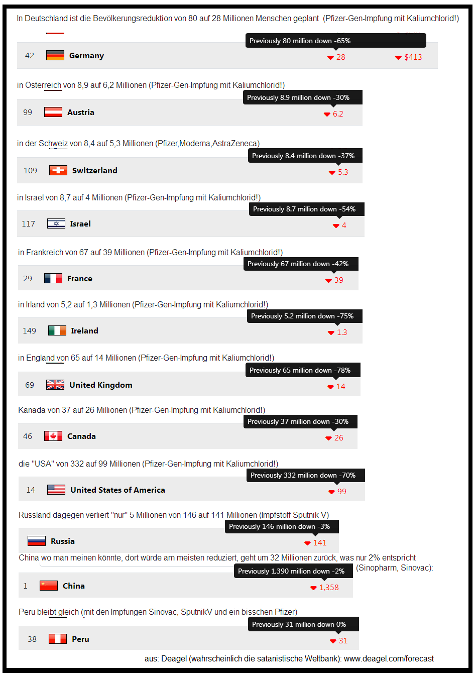 Die Webseite von Deagle (www.deagel.com/forecast) hat eine Vorhersage der Bevölkerungen der Länder weltweit: Genau DORT reduziert sich die Bevölkerung am MEISTEN, wo die Gen-Impfungen Pfizer+Moderna und die AstraZeneca gespritzt werden - das ist nur meine Beobachtung - ich meine, das ist KEIN Zufall!