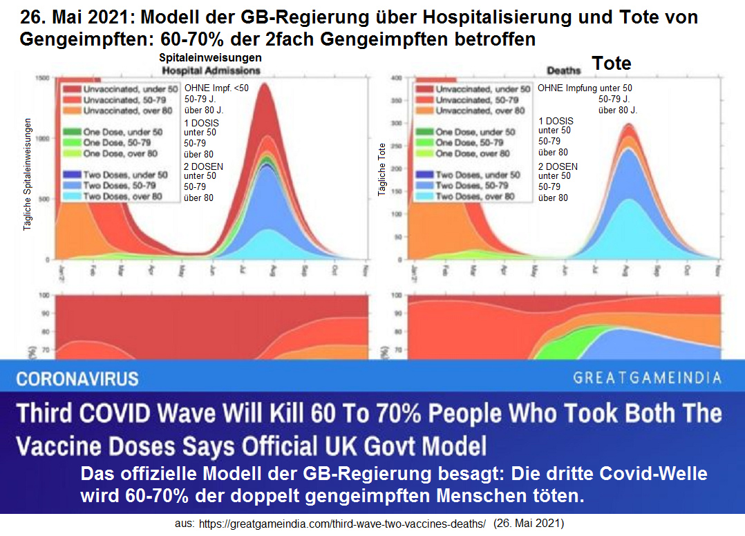 <Nach Hochrechnungen der führenden britischen Modellierungsagentur wird die dritte Welle des COVID-19-Spikes 60 bis 70% der Menschen, die beide Impfstoffdosen erhalten haben, hospitalisieren und oder töten. Das Papier deutet darauf hin, dass der erneute Anstieg sowohl bei den Krankenhauseinweisungen als auch bei den Todesfällen von denjenigen dominiert werden wird, die zwei Dosen des Impfstoffs erhalten haben und etwa 60 % bzw. 70 % der Welle ausmachen.