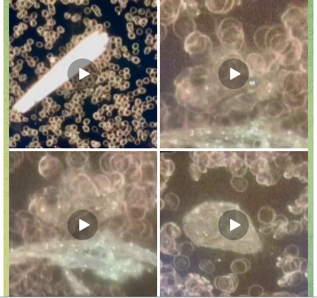 Hier sind weitere Fotos von GENgeimpftem Blut, wie sie Blutzellen sich stapeln und Gerinnsel bilden, und ausserdem schwimmen da Gegenstände im GENgeimpften Blut herum: