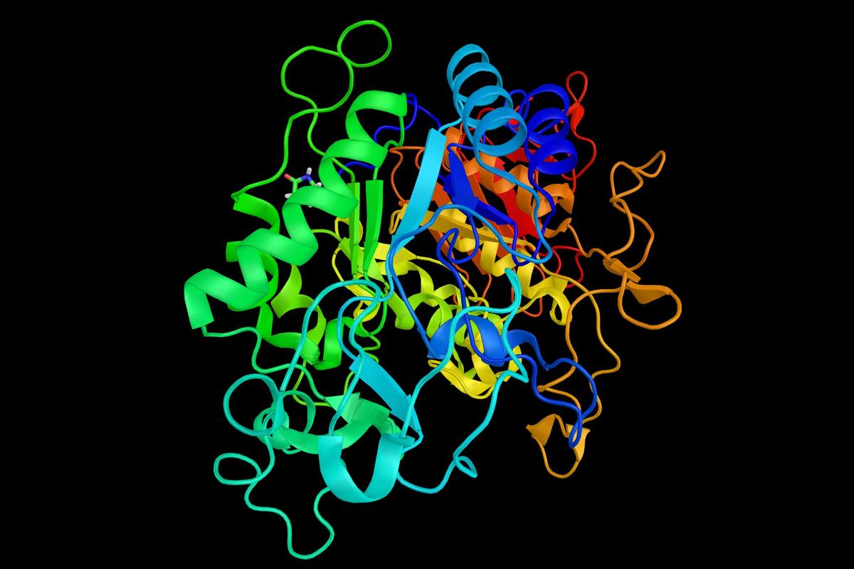 Amylase im 3D-Modell. Das Enzym spaltet große kettenförmige Stärkemoleküle auf - sowohl im Darm wie bei der Stärkeverzuckerung.