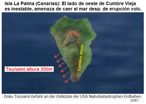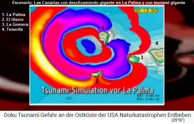 La causa del tsunami contra la costa este de "EE.UU." es el volcán de la isla de La Palma, una isla de las Islas Canarias cerca de la costa africana, las islas pertenecen a España (2'12''). La isla de La Palma tiene una cadena volcánica activa llamado "Cumbre Vieja" (2'17''). [Lo largo de esta cadena volcánica] en la isla se ha formado una grieta de casi 5 km de largo del norte al sur (2'35''). Si el volcán entrara en erupción, una parte entera de la isla podría desprenderse y caer al mar, la parte del flanco volcánico en cuestión tiene 16km de largo y 1600m de alto (2'55''). Esto podría desencadenar una ola marina (tsunami) con una altura inicial de 300 m (3'0'').