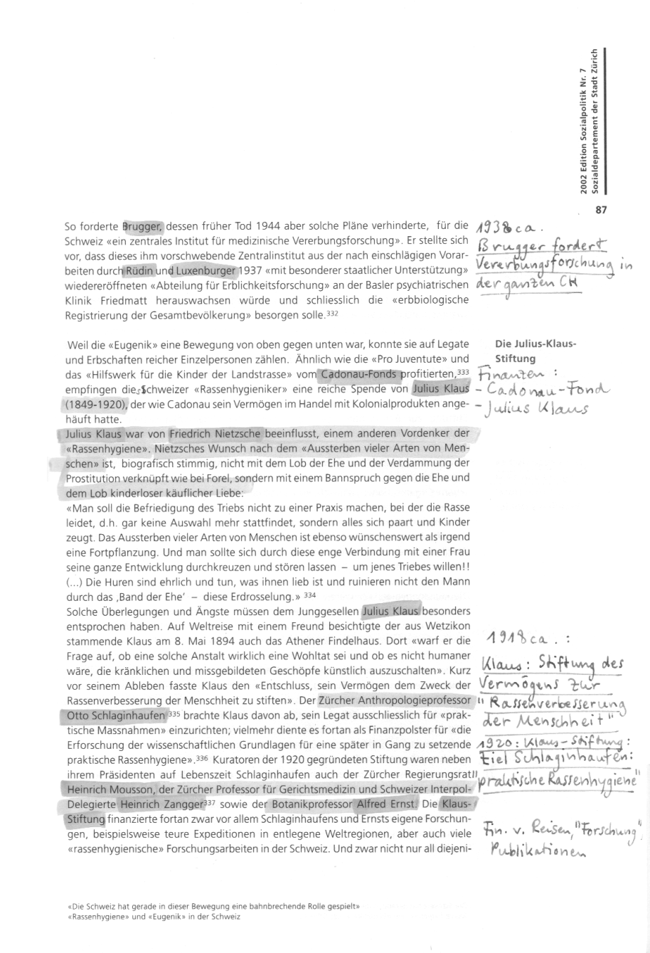 Thomas Huonker: "Fürsorge" in Zürich 1890 bis 1970; Sozialdepartement der Stadt Zürich 2002, S. 87