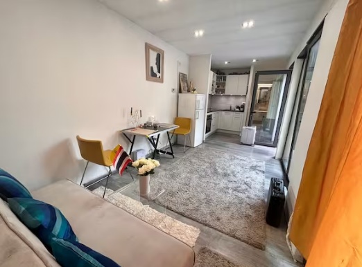 Auf zwei Etagen finden Mieter eine Küche, einen Tisch mit zwei Stühlen, ein Bad mit Dusche und einen kombinierten Sofa-Schlafbereich. Im Liegen geht der Blick durch den gläsernen Anbau bei wolkenlosem Himmel zu den Sternen.