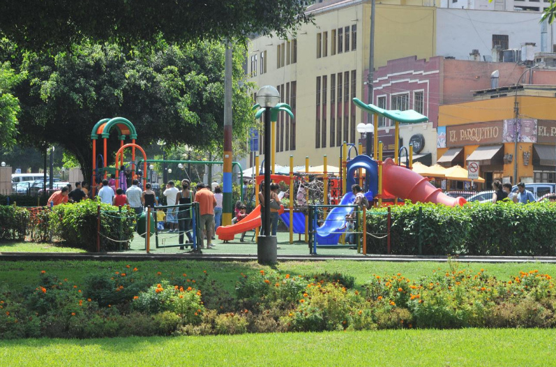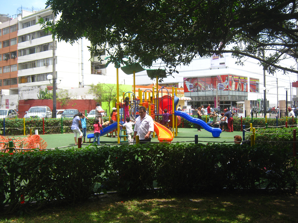 Ese parque infantil de Lima en el distrito de Miraflores con su césped artificial para niños de 2 a 5 años parece un modelo de verdad. El desagüe tiene que ser bueno. Por eso el sitio completo tiene que ser un poco inclinado así el piso va a ser seco rápidamente después de una lluvia.