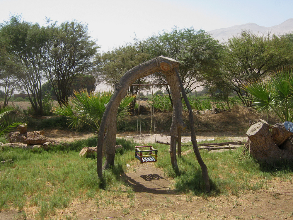 [19] Columpio de bebe en madera en la granja de Hari Krishna "Eco Truly" en el valle Lluta cerca de Arica en Chile: foto de Michael Palomino 2011