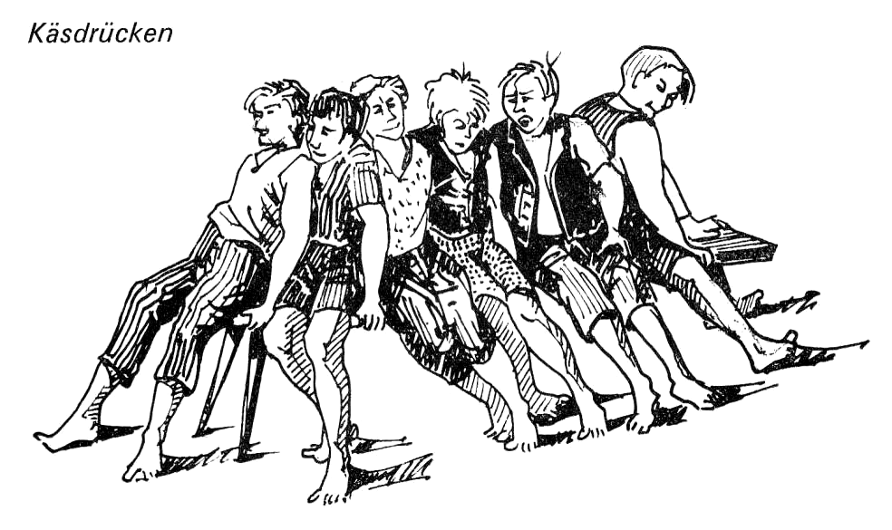 Eine Reihe Knaben lehnen sich Schulter an Schulter an eine Wand oder sitzen dicht nebeneinander auf einer Bank, die stärksten zu äusserst. Mit aller Kraft gilt es nun, einen aus der Reihe herauszudrücken. Wer herausgedrückt wird, ist "Chäs" (S.27).