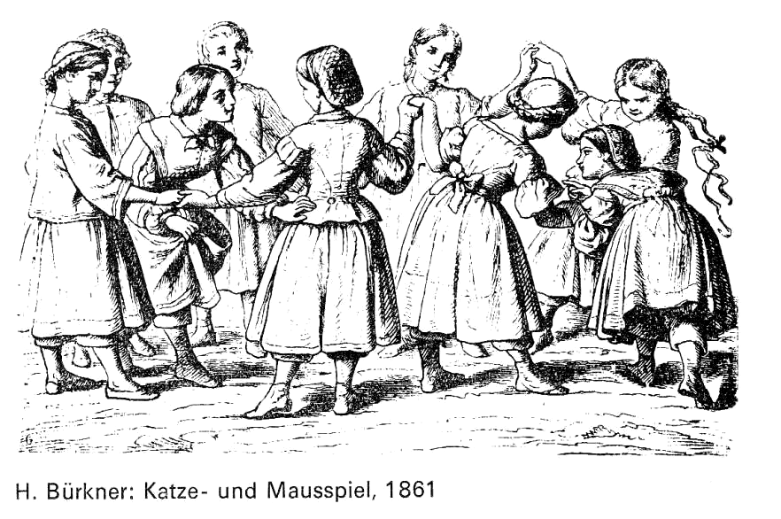 "Innenfrontkreis mit Handfassung: Die Maus befindet sich innerhalb, die Katze ausserhalb des Kreises. Vorausgehendes Frage- und Antwortspiel, regional verschieden, zum Beispiel: