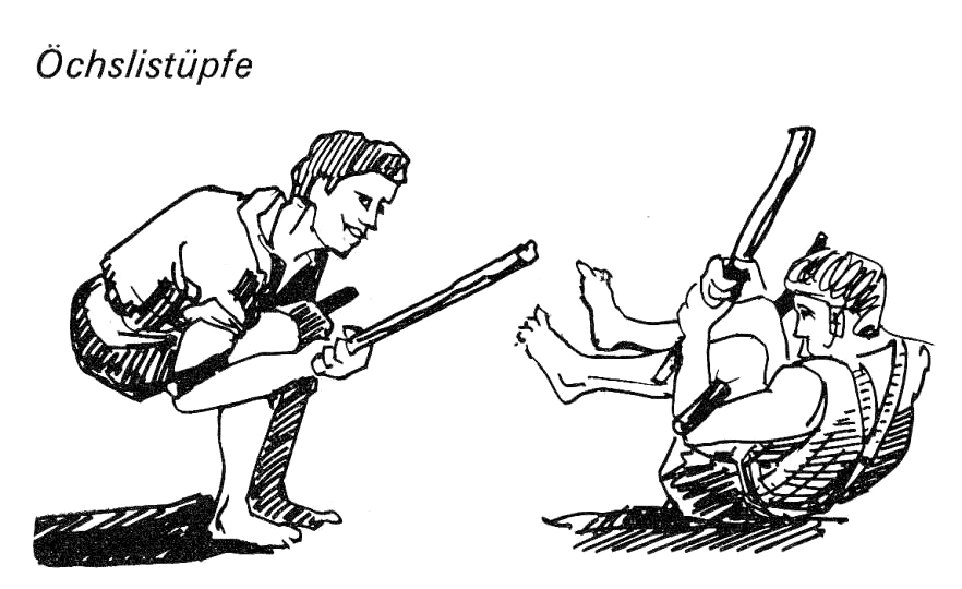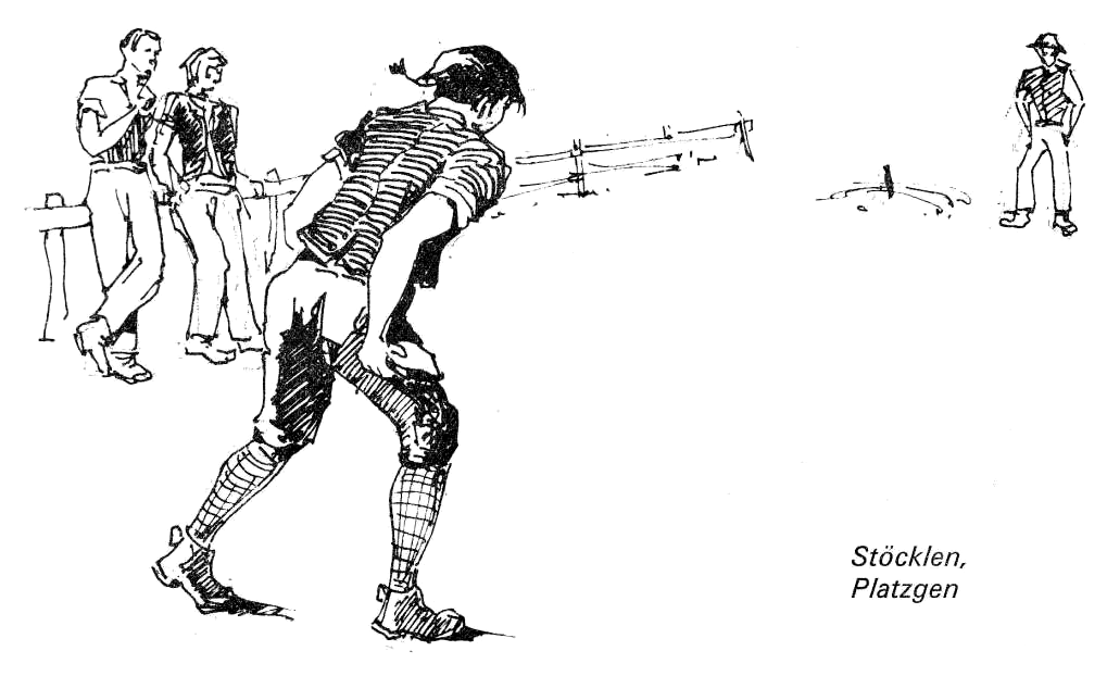aus: Alte Kinderspiele [in der Schweiz]. Eine Sammlung volkskundlicher Bewegungsspiele; von Walter Seiler, mit Zeichnungen von Gustav Ritschard; dargestellt anlässlich der 700-Jahrfeier Unterseens im Jahre 1979. Sonderdruck der Schweizerischen Lehrerzeitung, Ausgabe "Schulpraxis", Monatsschrift des Bernischen Lehrervereins BLV, Nr. 25, 21. Juni 1979. Druck: Eicher + Co., 3001 Bern