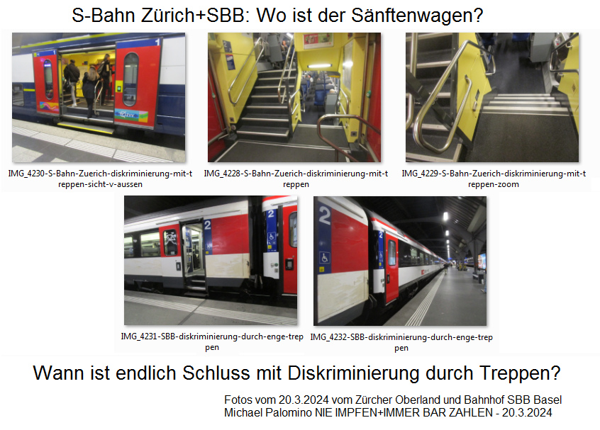 untauglich - wo ist der Sänftenwagen? Fälle: SBB, S-Bahn in Zürich [17,19] TGV in Frankreich (hier der TGV "Lyria" in Zürich) ist total asozial mit Treppenstufen an den Eingängen: Rollstuhlfahrer, Rollator und Kinderwagen haben KEINE Chance - Verdacht: Bei den SNCF sind asoziale RASSISTEN am Werk [20] |