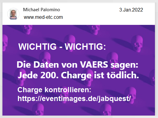 Auf VAERS kann nicht jeder Verdachtsfälle melden und dort wurden schon über 2Mio schwere Nebenerscheinungen gemolden bei ca. 200Mio geimpften und über 22'000 Tote. 1% aller Nebenwirkungen enden also mit dem Tot! siehe openVAERS.com