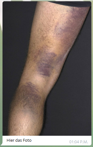 am 7.6.2021: Violette Flecken am Bein und im Gesicht