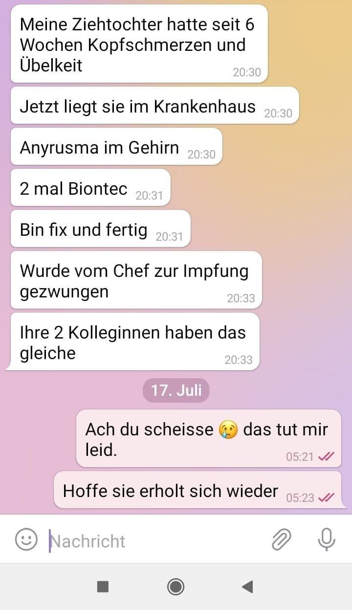 Der Arbeitskollege vom Bruder meines Freundes liegt nach der Impfung im Koma. Dazu habe ich keine näheren Angaben.