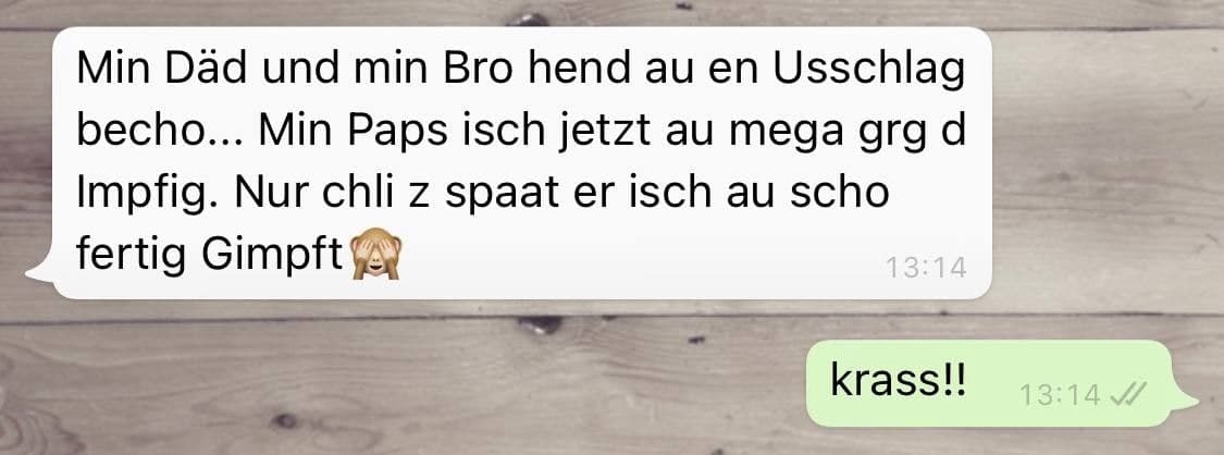 Der Vater unserer Lernenden (ca. 60) lag nach der 2. Impfung (Moderna) einen Tag komplett flach. Gemäss ihrer Aussage hat sie ihn in 18 Jahren noch nie krank erlebt, bis zum letzten Sonntag.