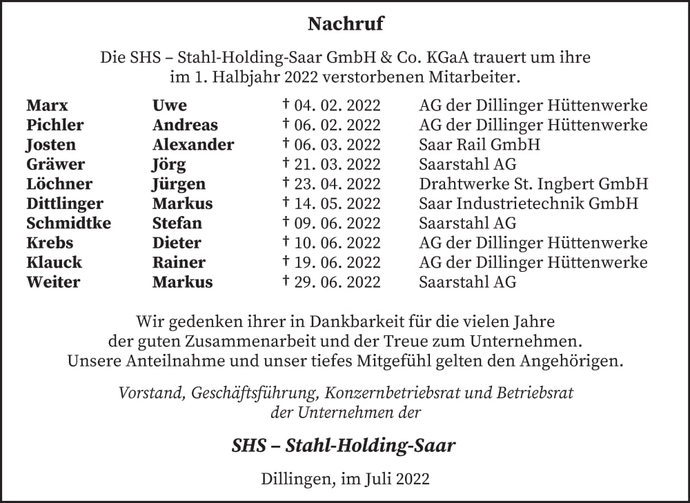 Auch heute haben wir wieder Todesanzeigen erhalten von