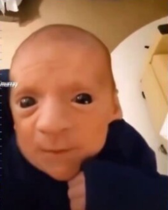 Transhumanes Baby in den "USA" 7.8.2022: Total schwarze Augen + Kopf aufrecht halten schon am Tag nach der Geburt + gigantischer Arm