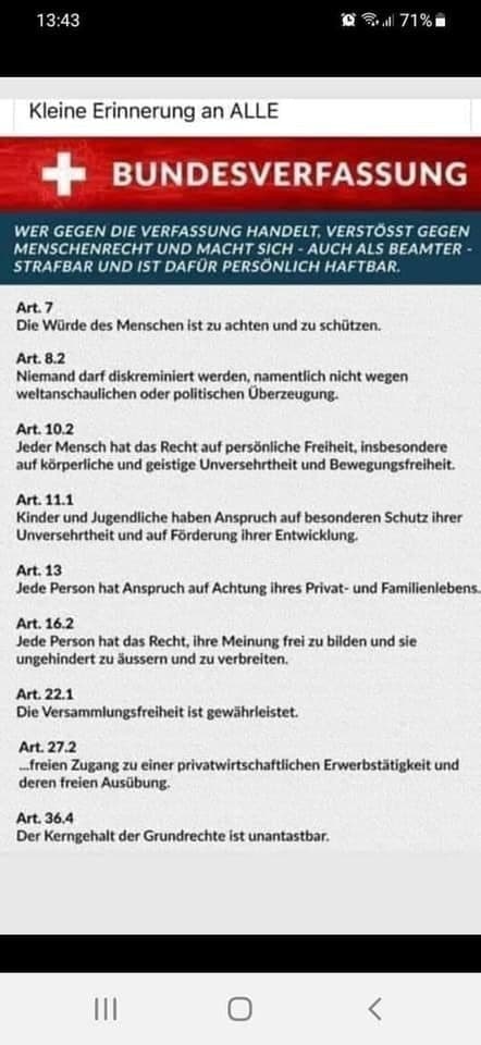 wieder mal was zum Erzählen: Die Demo in Bern war gegen Uni-Rektor Leumann mit der 3G-Diskriminierung gerichtet. Es kamen aber kaum StudentInnen. Zwei, die dort waren, waren geimpft und sagten, 80% der Studis seien geimpft. Insgesamt waren es ca. 2000 Leute, nicht 300, wie die Antifa-Zeitung Nau.ch schreibt. Der Spaziergang war 2 Stunden. Die Pitbull-Polizei hatte das Bundeshaus abgesperrt, wir durften dort nicht vorbei. Angeblich wurde auch Pfefferspray eingesetzt. Also wir leben in einer Pfefferspray-Diktatur. Auf einer Sitzung von Widerstand 2020 wurde vor ein paar Tagen gesagt, man kann auch einfach Wespenspray nehmen, wirkt auch auf 5m!