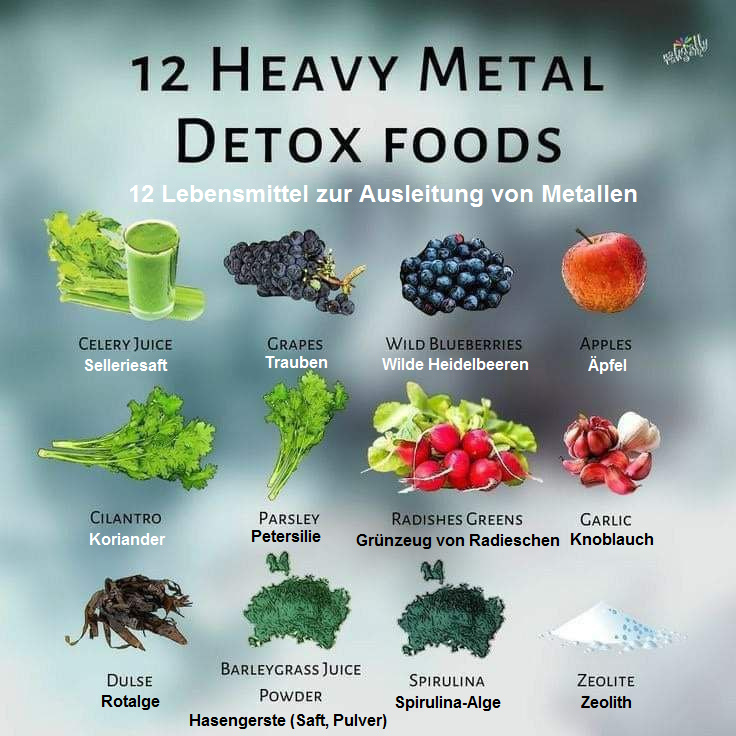 Natron - Blutgruppenernährung - Brennnessel - Bärlauch (Pesto) für die Leber - Löwenzahn für den Gallenfluss - Kombucha-Teepilz - gegen Schwermetalle: Selenpräparate, Afa-Alge, Koriander, Chlorella-Alge, Bärlauch - Wasser, Kräutertees - feucht-warmer Leberwickel - Lunge durchlüften mit Wandern - Vit.C=Schutz - gegen Schwermetalle: Enzym Motallothionein - Selen neutralisiert Quecksilber - Zink neutralisiert Kupfer - Zeolith zieht Gifte und Metalle aus dem Magen-Darm-Trakt raus - Knoblauch - Weizengras - Vit. B6 - Gemüsesäfte - Chlorella-Alge - Sauna - Ingwer - Ingwer verstärkt Knoblauch - Brunnenkresse - Gartenkresse - Selleriesaft - Trauben - wilde Heidelbeeren - Apfel - Koriander - Petersilie - Grünzeug von Radieschen - Knoblauch - Rotalge - Hasengerste (Saft, Pulver) - Spirulina-Alge - Zeolith - Merrettich - Sauerkraut - Sonnenschein -