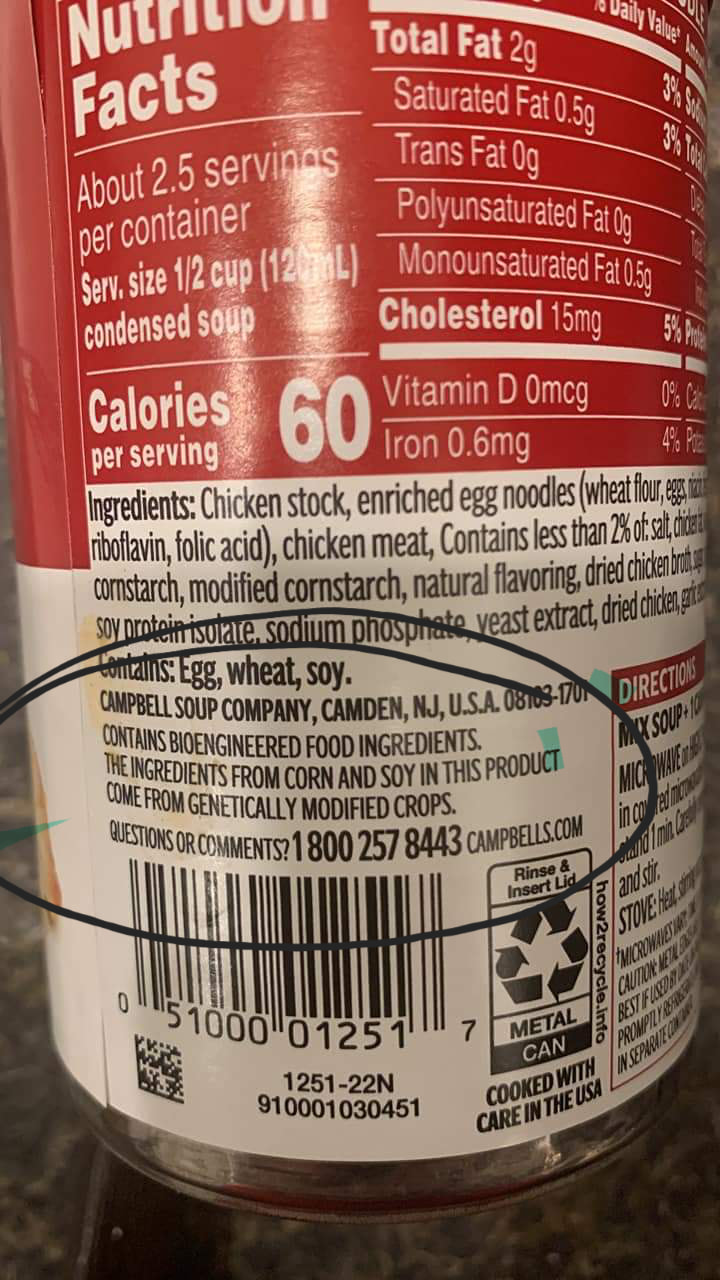 The label on Campbell's Chicken Noodle Soup says, Contains bioengineered food ingredients. I googled it, and it states:
