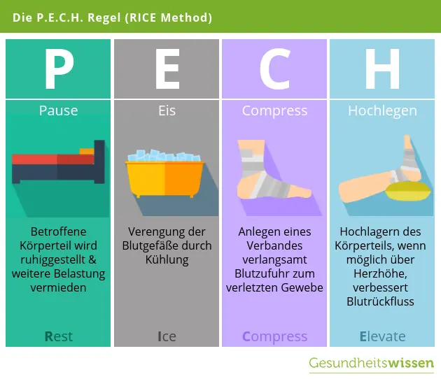 Das „PECH”-Prinzip bietet einen brauchbaren Leitfaden zur Behandlung von Blutergüssen: PECH steht für Pause, Eiskühlung, Compression (beispielsweise durch das Anlegen eines Verbandes) und Hochlegen.